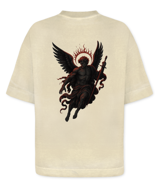 A estampa “Scourge” traz uma composição poderosa e sombria, representando um anjo guerreiro envolto em chamas celestiais, com traços densos em preto e vermelho incandescente. O desenho mistura força e mistério, destacando o contraste entre o sagrado e o sombrio — um símbolo visual de rebeldia, poder e transcendência. No peito, a palavra “SCOURGE” surge em uma tipografia gótica agressiva, ladeada por asas monumentais e labaredas ascendentes, criando uma aura de autoridade e intensidade espiritual. Os detalhes em vermelho queimado percorrem todo o design, simulando brasas sobre o tecido e realçando a profundidade da arte. Essa arte foi desenvolvida para camisetas oversized boxy fit, valorizando o caimento solto e reto do modelo. A estampa centralizada garante equilíbrio visual e destaque máximo no peito, perfeita para composições urbanas e estilo darkwear premium.